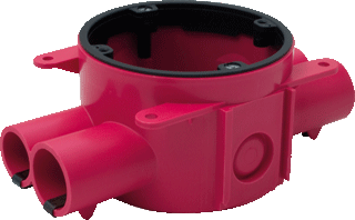 ABB HAF brandwerend hw doos voor montage in wand/plafond, kunststof, rood, diameter 76mm, diepte 52mm, holle wand, rond, bouwvorm apparaatdoos, uitvoering 1-voudig, geschikt voor zwakstroom, inwendige diepte 50mm, voor aantal inbouwsokkels 1, bevestiging schakelmateriaal schroeven, met schroeven