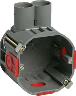 Voorzien van geïntegreerde, soepel scharnierende combituit. Tevens toepasbaar in betonstenen met een leidingsleuf (MBI B2 blokken). Voorzien van 2 conische buisinvoeren met geïntegreerde vergrendeling voor zowel 16 als 19 mm buis, waarvan er één is afgesloten door een uitbreekpoort. Stevige montage van de doos in de wand dankzij de metalen schroefplaatjes met 3-voudige spoed. Geen kiervorming tussen schakelmateriaal en wand door zeer dunne, stevige oplegrand van de metalen bevestigingssetjes. Extra doorvoermogelijkheid bij gekoppelde dozen. Afstand tot buisinvoer: 29mm.