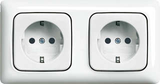 Dubbele wandcontactdoos met randaarde compleet met dubbel afdekraam. Past alleen in een duo inbouwdoos. De wandcontactdozen zijn doorgelust.