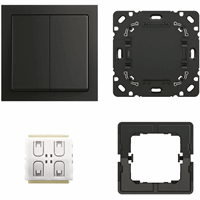 Friends of Hue bedieningsset voor het schakelen en dimmen van Philips Hue-lampen. Bestaande uit Friends of Hue smart switch insert 6716 U-500, 2-voudig bedieningswip 6736 FoH-885, 1-voudig future® lineair afdekraam, bevestigingsplaat en tussenring.