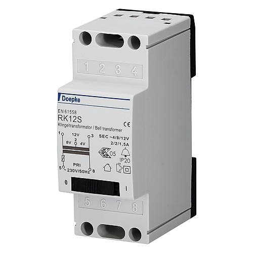 Beltrafo 4-8-12Volt met handige Aan-/uitschakelaar. Geschikt voor din rail. 2 module breed (36mm). met 8V levert deze trafo 2Ampere. Bij 12V 1,5Amp.