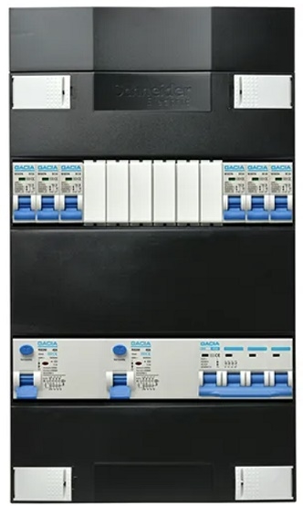 Gacia met Schneider kast 3-Fase groepenkast 6xB16A + 2x aardlekschakelaar 4-polig 30mA + hoofdschakelaar 4-polig