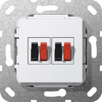 Basiselement luidsprekeraansluiting tweevoudig zuiver wit glanzend Kenmerken: - Frontaansluiting: steekklemmen, rood zwart. - Achteraansluiting: schroefklemmen. Aanwijzingen : - Alleen voor schroefbevestiging. - Let op! Houd rekening met de benodigde ru