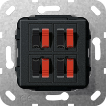 Basiselement luidsprekeraansluiting viervoudig zwart mat Kenmerken: - Frontaansluiting: steekklemmen, rood zwart. - Achteraansluiting: schroefklemmen. Aanwijzingen : - Alleen voor schroefbevestiging. - Let op! Houd rekening met de benodigde ruimte voor