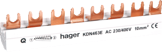 Hager quickbusbar kamrail, diameter 3mm², lengte 140mm, 3 fasen, geschikt voor aantal apparaten 2, delingsmaat 18mm, nom. continustroom iu 63a, uitvoering elektrische aansluiting vork, geïsoleerd, toegekende stootspanning 400kv, nom. bedrijfsspanning ue 400v, geschikt voor apparaten met nulgele
