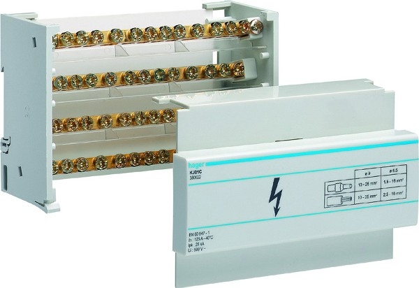 Hager kj aansluitklem voor hoofdkabel, (hxbxd) 86x130x44mm, 4 polen, aansluitwijze schroef, 10 aansluitingen 16 mm², 2 aansluitingen > 25 mm², din-rail, aanrakingsveilig, clipbaar