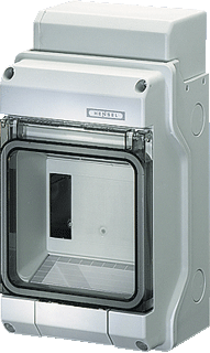 Verdeelkasten uit hoogwaardig thermoplast. Voor opbouwtoepassingen in gebouwen of beschermde buitenopstelling. Automatenkast, met 4,5 modulen, voor de inbouw van apparaten met klikbevestiging op DIN-rail. Kabelinvoer via geïntegreerde elastische afdichtmem