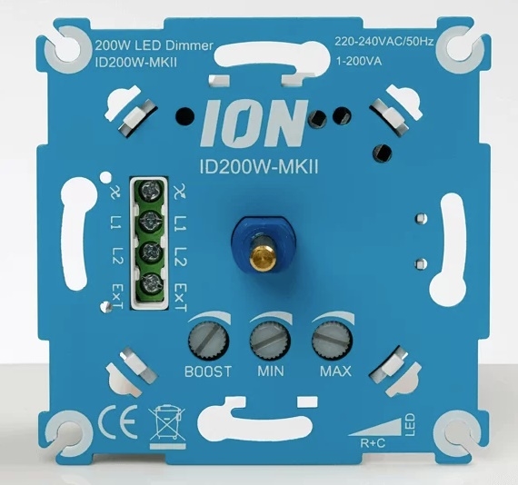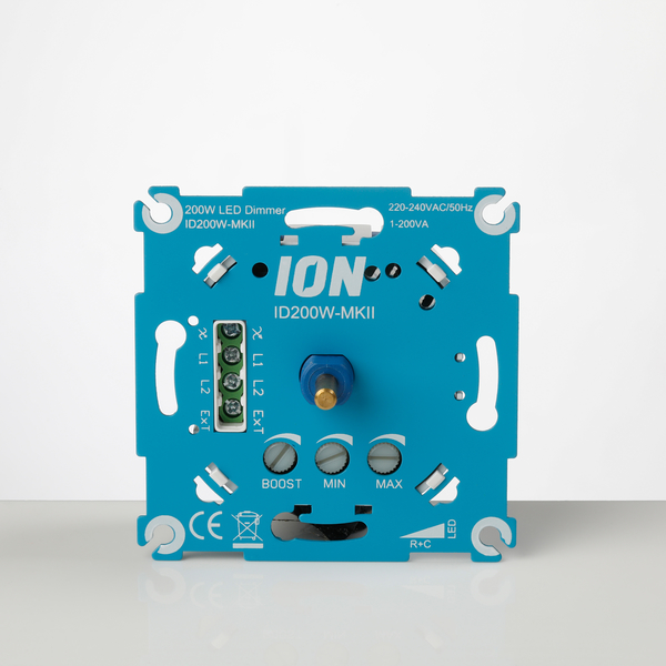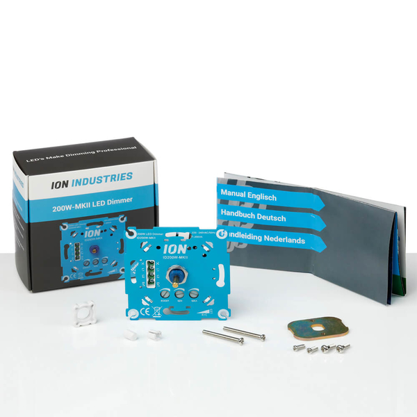 Dimt alle LED. Professionele dimmer van Ion Industries voor het dimmen van uw LED verlichting. Halogeen en Gloeilampen van 0 tot 200 Watt. Geschikt voor Gira, Jung, Berker, Busch Jaeger, Merten en Niko dimmerplaten. Deze LED dimmer is zo te stellen dat deze niet knippert.