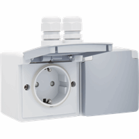 Bij deze horizontale combinatie zijn de twee spuitwaterdichte stopcontacten voorzien van randaarde, beschermingsafsluiters en insteekklemmen. Beide stopcontacten zijn eveneens voorzien van een beschermklep met scharnieren en zijn voorbedraad (2,5 mm²) en g