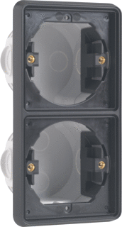 Montagewijze overig, Vorm rechthoekig, Bouwvorm inbouwdoos (apparaatdoos), Uitvoering dubbel, Uitgerust met geen, Voor aantal inbouwsokkels 2, Bevestiging schakelmateriaal schroeven, Met schroeven, Type behuizingsdoorvoer uitbreekpoort, Voor buisdiameter 16 mm, Achterinvoer, Aantal invoeren 4, Materiaal kunststof, Halogeenvrij, Oppervlaktebescherming geen (onbehandeld), Kleur zwart, Beschermingsgraad (IP) ip55, Deksel geen, Functiebehoud geen, Winddicht, Behuizingsdoorvoer via uitbreekopening, Speciale toepassing overig