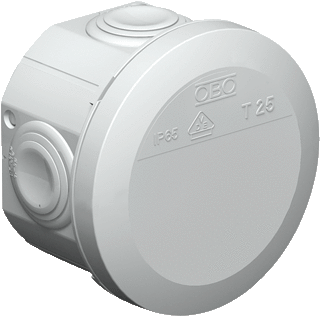 OBO t-box 25 doos voor montage op wand/plafond, max. aderdoorsnede 2.5mm², rond, wand-/plafondmontage, wartel uitbreekpoorten 4, achterinvoer