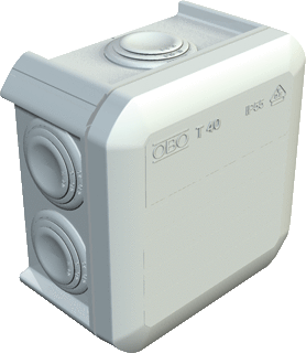 OBO t-box 40 doos voor montage op wand/plafond, max. aderdoorsnede 4mm², vierkant, wand-/plafondmontage, wartel uitbreekpoorten 7, achterinvoer