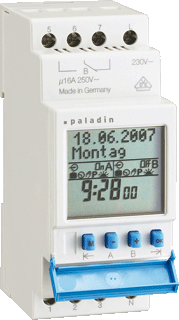 Paladin terminal digitale schakelklok vr paneelbouw, din-rail, 1 kanalen, voedingsspanning 210 - 230v, spanningstype voedingsspanning ac, frequentie voedingsspanning 50 - 60hz, autonomie in uren 52560, autonomie in jaren 6, tekstbegeleiding in het display, 60-min. programma, 24-uurs programma, met astrofunctie: automatische schakeling m.b.t. zonsopgang of ondergang. in- en uitschakeltijden met astrofunctie worden dagelijks opnieuw berekend. de klok "weet" wanneer de zon onder gaat en wanneer de zon opkomt. hierdoor kunt u de schakelklok bijvoorbeeld in laten schakelen als het donker wordt, en bij nacht uit laten schakelen op zijn schakelklok. het inschakelen gebeurd weer op de schakelklok en het uitschakel op de schemerschakeling als het licht wordt. dit is ieaal voor onder andere reclameverlichting. 1-kanaals dag- en weekprogramma, lcd display, meertalig, waaronder nederlands, programmeerbaar en tekstbegeleiding in display. 60 geheugenplaatsen, automatische zomer-/ wintertijdschakeling. met lithiumbatterij gangreserve circa 6 jaar. voorzien van bedrijfsurenteller en pincode beveiligingsfunctie. wisselcontact (potentiaalvrij), 250v ac 16 amp. energieverbruik circa 1,5va. kortste schakeltijd 1 minuut, kwartsgestuurd. omgevingstemperatuur -10gr.c tot +55gr.c